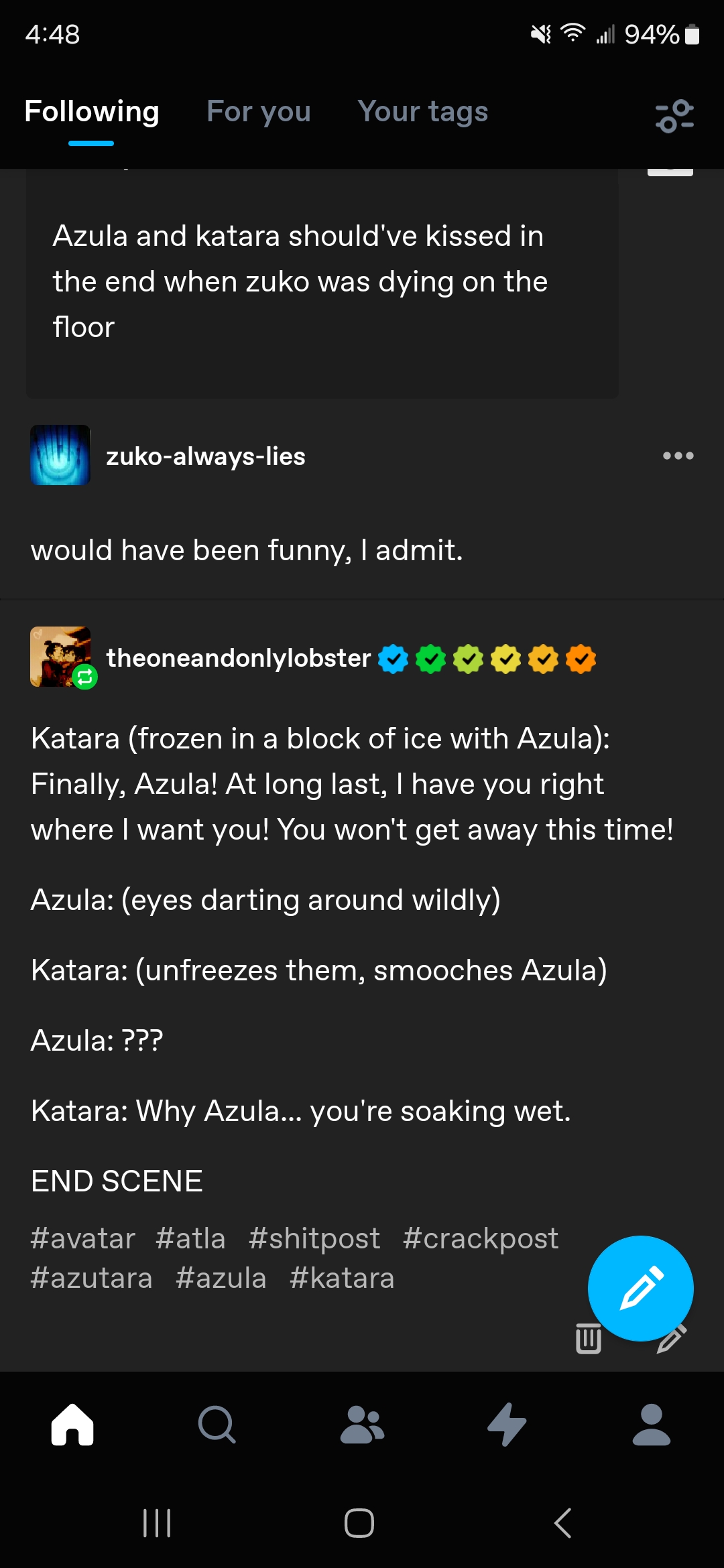 Azula and katara should've kissed in the end when zuko was dying on the floorMe: lol k why not it's 4:30 am and I'm still on the hellsite